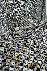 In this skirt we see the high workmanship of the luxury suppliers of the fashion industry. At first glance, you might almost think it to be a tweed Chanel piece but then as you look at it closer you realize that every inch is covered with overlapping silver sequins. The sequins are held in place by an ivory, gold and black thread and this is what gives them the appearance of that classic Chanel tweed. The sequins catch the light from every angle. It is exceptional. Running down the front is a panel of glittering crystals that are bordered with faux pearls on either side and the pearls are all caught into a black corded cage. That same detail runs down the centre of the skirt at the back. It is fitted around the waist, but without an added band so you lose no detail of that stunning design, and then it glides over the hips and flares out to the hem. The skirt has never been worn and has its original Chanel packet. Excellent condition