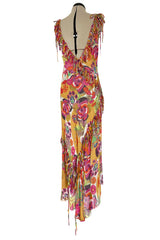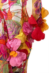 This dress is made from a fine silk crepe chiffon that is cut completely on the bias. It is very beautiful. The silk is covered in one of his more vibrant prints and I love it. An explosion of flowers cover every inch of the dress. The signature bias cut that he often did allows the dress to skim and drape over the body so that is shows every curve but is not overly fitted. The seaming is highly reminiscent of the work you see from the twenties and thirties which became another of John's signatures. The fabric has been pieced together and laid out to form a low dipping bodice and then low dropped angled panels that create the various parts of the pattern that you see. Set along the seams are loops made out of the same fabric and I love how some are only attached at one end so you get this bit of a raw decadent feel. This also creates incredible movement. All those loops move as you move and the effect is fabulous. The dress is suspended from wide straps that curve over each shoulder. The bodice is simple and soft with dropped seams. It glides over the body and then flares out as it reaches the hem. The widening of the hem is created by the way the panels are inset. It is an incredible feat of patterning. The skirt falls longer at the back and the sides are cut higher as well. There are slits up the side to add to the movement of the skirt. This also gives you a flash of leg when you sit or move. The back is a low V that leaves a bare expanse of skin to show. The dress is even better in person and on the body as the static photos cannot fully convey how a bias cut dress moves. They only truly come to life when worn. This one also comes with a matching silk chiffon stole that is cut extra long and wide and is finished with a trim of silk flower petals. I have shown several ways that it can be worn and there are probably more. It is an incredible example of his work and looks to have been worn very little if at all. Excellent condition