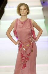 This Chanel dress is phenomenal. This is the kind of dress that you see in real life and it makes you swoon. As good as it looks in the photos it only really comes to life on the body. When you move in it the air around you picks up the silk chiffon that it is made out of and it has the most beautiful movement. The dress is cut with a very soft and easy feel much like the dresses of the twenties and thirties. The bodice is cut to skim over you. The neckline is cut wide across and it softly drapes down a touch at the center dips softly down with angled seaming under that. The main colour is a soft dusty rose and there is a second deeper pinky red wherever he added a ruffled effect. The sleeves are one of those places and they drape around the top of the arm and are so pretty. The dress is entirely cut on the bias above and below the seamed waist so that it drapes down and over the bust and then around the hips and to the floor to show off your curves. On the runway it was styled with a classic Chanel chain belt and you could add something similar or wear it as it is. The skirt is seamed on angles to again give a nod to the seaming of the twenties and thirties. The hem curves around you and dips up at the front to show some leg. From the waist down to the top of that front where it curves up are two more rows of ruffles in those two tones of pink. These move so prettily when you walk. There is a seam just under that and this seam curves around you and the lower skirts are set into that. This allows the lower skirts to really flare out and move as you move. You can see that in the runway video. I love that the inside of the lower skirt is also lined with the deeper toned chiffon. He then extended the back to go just past the hem to create a slight trained effect behind you. If all of that wasn't enough the dress closes with a row of domed pearl buttons at the back. Each button is embossed with a tiny pink Chanel across its surface too. The entire dress is as light as a feather once on and it is almost like having nothing on at all. All of the added ruffles and layers of silk move with your slightest movement. It is just amazing and even better in person. It appears to have never been worn or worn very little. Excellent condition