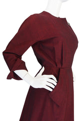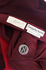 This beautiful and early example of Christian Diors work is quite extraordinary. This is the New York label so is what I consider to be demi-couture from this time period of Dior's history. These where made in, and for, the American market but were based on the runway designs and with many of the same high standard finishes that the true Haute Couture pieces incorporated. When held off the hanger it actually has some weight to it, not because the fabric is thick or bulky but because there is so much of it worked through the skirt. Once on it feels perfectly balanced but it is astonishing how much fabric there is. This is due to the clever design. Inside the skirt is a shorter inner silk lining and over this are two panels of fabric that wrap and overlap each other ending at each opposite hip. Each has a gathering of flat pleats mainly where it ends at the hip and the amount of fabric within the pleats is deceptive from how it lies when on. Under each hip is a bit of tulle to help gently curve the hip and create that desired hourglass. The bodice is equally remarkable and it buttons into place and has a high point design element on one shoulder. Little notched cuffs pick up this angular design and a saucy pocket sits on one hip. Big bow adorned silver toned buttons are the perfect finish. Excellent, museum quality condition.