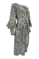 This wonderful little dress is a testament to the greatness of James Galanos who was one of the great American Couturiers. Galanos made couture-level dresses and gowns with a level of craftsmanship that left France’s most esteemed couturiers with their mouths agape. The immaculate construction of a Galanos piece oozed luxury, privilege, and high society (with price points to match). He was a master cutter and he used couture techniques. Here he uses a fine and lightweight to create this wonderful day dress. The black silk is printed with a tightly spaced clover print. I love that each clover leaf is actually a little heart. Perhaps a subtle nod to being 'lucky in love'? Every detail on it is perfect and every seam is placed to ensure that the dress falls and sits properly once on and flatters the person wearing it. There is a small discreet slit on the front at the neck and another at the back and each closes at the top with a fabric knot button. The fabric is actually folded and pleated over these so you get a very pretty and couture feeling effect. The sleeves are fantastic and each billows out above their long buttons cuffs dramatically. The skirt falls in a sleek sheath and the waist is shaped and cinched with the long matching tie. It is an amazing original Galanos piece that is very modern feeling and wearable. Excellent condition with a small note below to review.