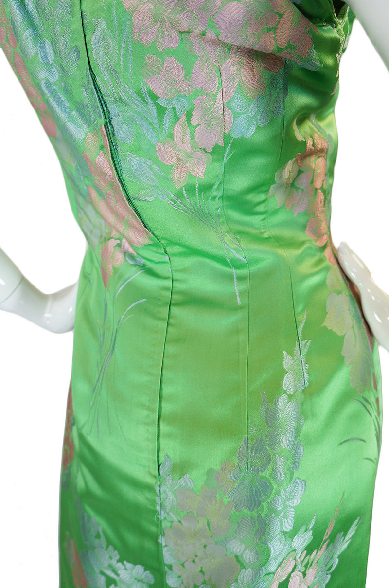 I love the classic cut of this suit with it's box jacket and slim pencil skirted dress. And I could go on for days about the fabric! It is rich and luxe and amazing! Really one of the best example of silk and textiles of this period I have seen! The dress is a slim cut simple shift that is cut to skim over your curves. It is refined and graceful and the color is perfection. I love the coppery pink thread mixed with silvers that is woven into the soft green silk back drop. The colors pop off each other and it just adds to the rich feel of the set. The jacket is classic box cut but with wonderful details like that wide band at the bottom back and the fabric covered buttons. It is simplicity mixed with a masterful seaming and cutting and extraordinary fabric. This is from the Custom line to the equivalent of a a made to order one step under couture piece! Excellent condition and a true beauty