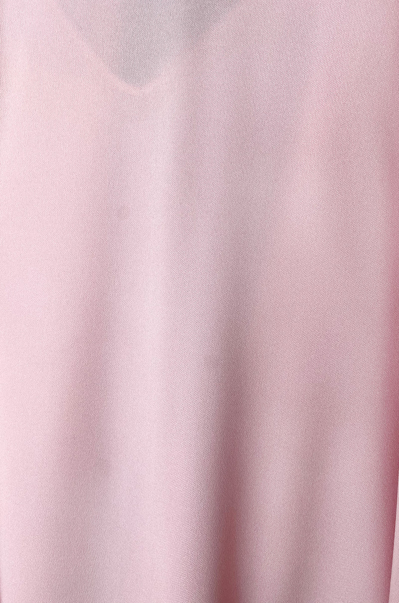 Fully lined through the body with a pink nylon jersey and closes with a back zipper. The fabric is a pink synthetic jersey. In very bright light I see two small and light marks at the front. They are very faint but there. Please see the final photo where I tried tp capture them. This one is not labeled but is the same as the red one I just had and from the same woman. The loose cut should work on a range of sizes