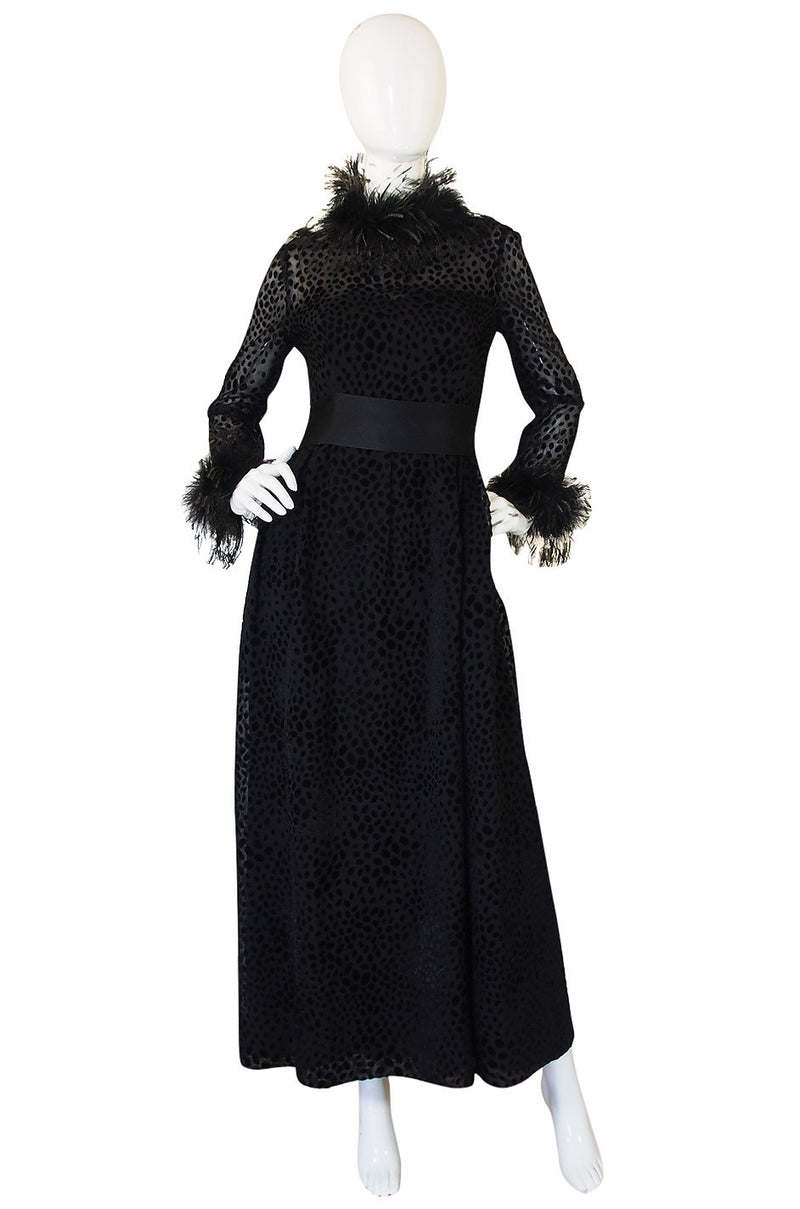 Absolutely stunning silk net full length dress by Mollie Parnis, who one of my favorite American designers! The dress is from her companies high end, demi-couture line and it shows. It is a fantastical combination if silk with a velvet pattern fused to the fabric and of course that feather detailing at the cuffs and neck! Each sleeve and the collar is finished with a a beautiful circle of glossy black feathers giving the gown a truly dramatic feel. The waist is defined by a wide silk sating ribbon that gives the perfect contrast. The sleeves are left unlined to counter balance the fabric that covers you from head to toe. It is really the fabric that is the star after the feather treatment - it is a light silk chiffon that has an abstract dot pattern of fused velvet. I love the contrast this creates. That textural effect paired with the high drama of the feathers make for a real show stopper. Excellent condition