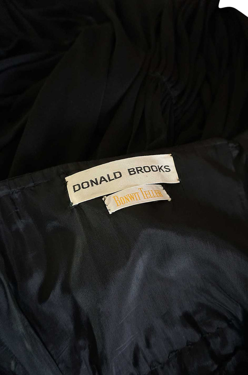 I love Donald Brooks pieces and this little black strapless number is a great example of how he could do sleek and simple superbly. It is made of a slinky, fluid jersey and its simple exterior hides a very well constructed interior. The strapless bodice hugs your torso and is held in place by an inner corset that hooks to close under the top layer. This gives you a sleek line and shape. Under this the skirt falls to just about the ankle, or just above depending on your height, and there is an astonishing amount of fabric in that skirt. The fabric is light weight enough that it falls perfectly when you are standing still and does not seem bulky, but the second you move (or twirl across a dance floor) the amount of fabric becomes apparent. It is finished with two long panels of fabric that are attached at the back and then curve around the front and loop through the loop at the front center east. These then hang down the front in long ties. I am sure you could get creative and style them a few interesting ways too. Excellent condition