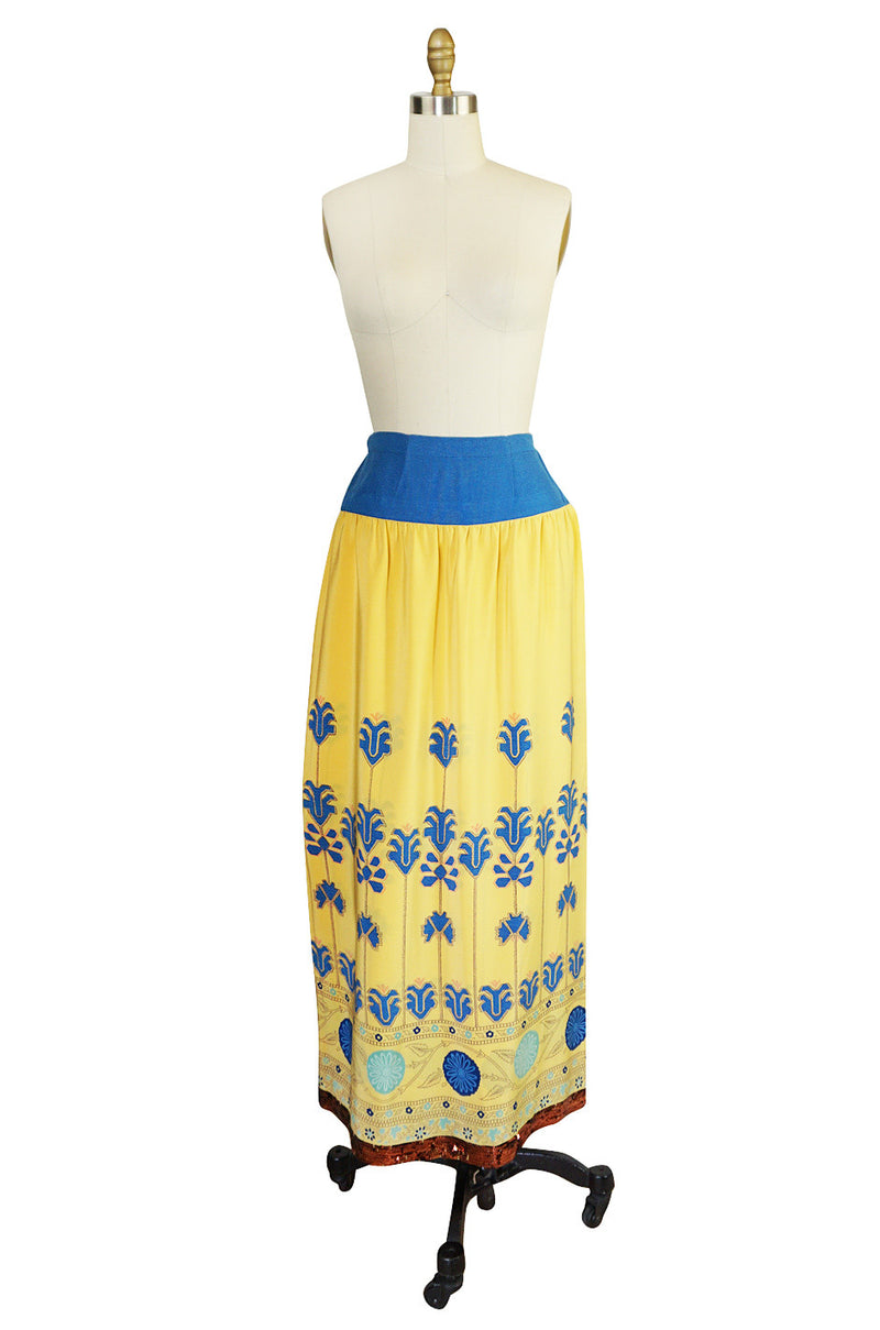 This Lanvin wrap skirt is utterly fantastic. It looks like it could have been made this season it is in such remarkable condition and I am in absolute love with it - the color, the design, the workmanship - everything about it is perfection. It is really a once in a lifetime piece! The fabric is a light fine silk that has a hand screened, exotic print in shades of blue on a yellow backdrop. The beauty of the color combination is equaled by the fine workmanship that has gone into constructing it. It wraps over itself and hooks into place with hidden set hooks along both sides of the waist. The waist band is dine in a blue for the perfect balance to the print of the skirt. I love the hand applied dense row of glossy copper sequins that finishes the bottom hem. It is really a work of art and the numbered couture tag makes it that mush more special. Excellent, museum quality condition.