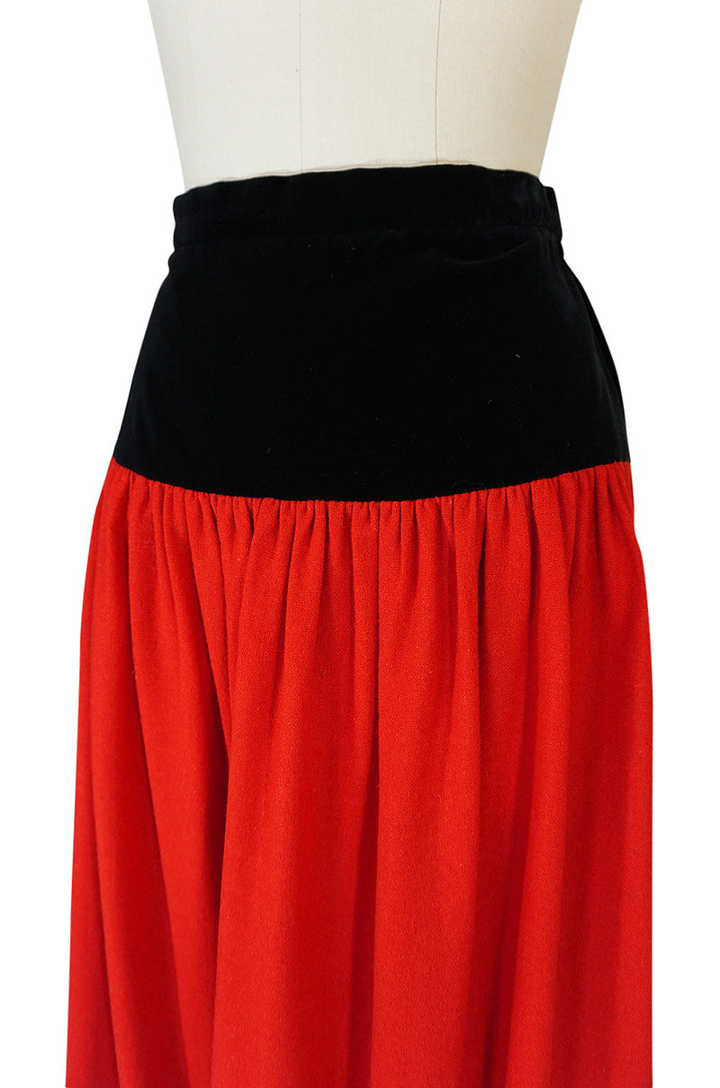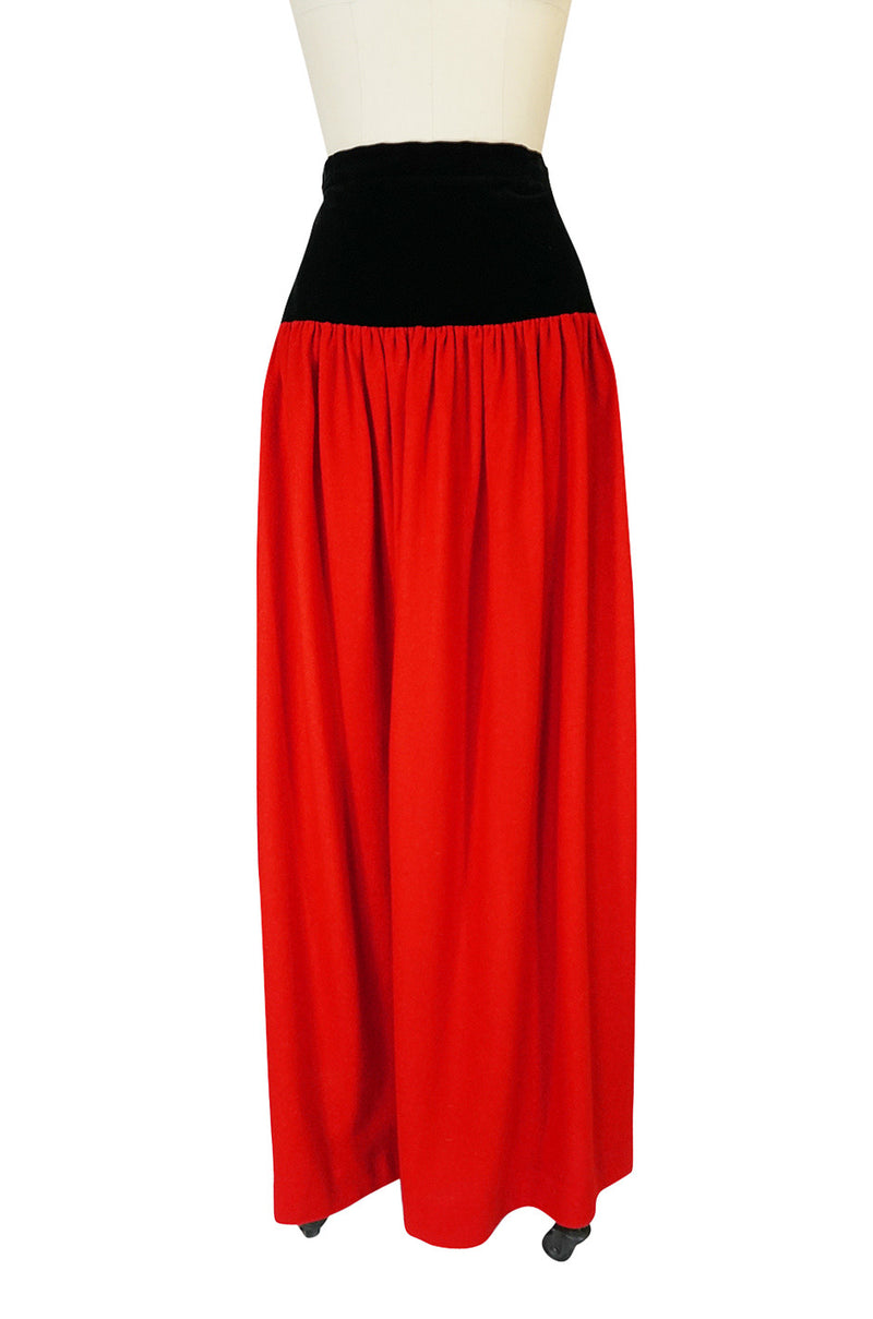 This look was one of the cornerstones to the famous "Russian peasant" Haute Couture collections with its banded and fitted upper hip and flowing skirt. This is from the Rive Gauche line so would have been produced for the fall season just after the Couture show and it is glorious. The red is a mix of wool with just a touch of angora that gives it a bit of a texture while still allowing the fabric to be light and fine. The band around the hip that perfectly balances the volume of the lower skirt is done in a black velvet that acts as an anchor and gives the illusion of slimness and shape as it curves up to the waist. It falls in a long and lean column when still but there is a volume there that will show when you move or walk. These were worn with his signature voluminous tops and colors were mixed with riotous abandon. The Russian collection is one that is constantly referenced and looked back upon as one of his greatest achievements and having a skirt like this in your collection will be a coup. It still feels insanely fresh and modern with endless styling possibilities. Excellent condition.