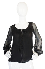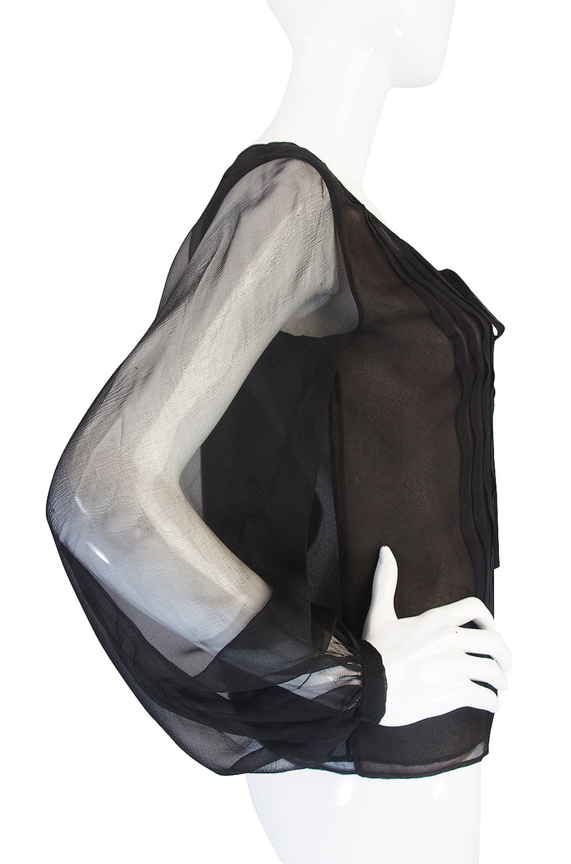 This would have been designed and created under the eye of Yves himself for that famous 'Opéra Les Ballets Russes' collection and this has the added specialness of coming directly from the daughter of the Haute Couture client so has not been on the market prior to this. The blouse is exquisite and of course it is entirely hand made as the parameters of Haute Couture define. The silk chiffon is of the finest grade and you can feel the difference at first touch. I love the little row of tightly spaced, hand covered buttons that run down the front. On either side are tiny, perfect hand done flat pleats and a feminine bow sits at the neck. The body of the blouse is cut loose and easy and each sleeve has a slight puffed volume above the buttoned cuff. It is absolutely exquisite and a stunning example of Haute Couture while Yves was alive from a collection that changed the fashion world. Excellent condition