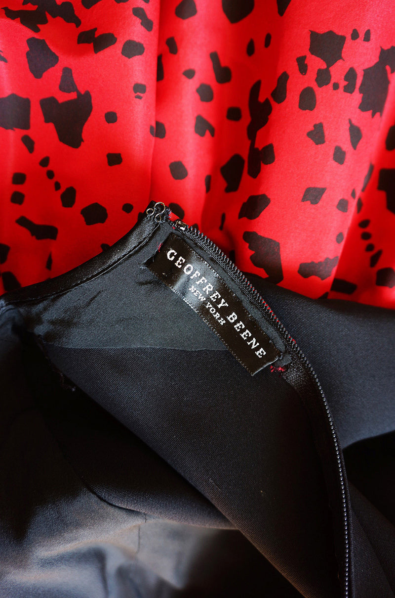 What a stunning dress! This is an amazing example of Geoffrey Beene's work during this time period and it is one of the best made dresses from this time period I have seen in a while. The details in the construction are just wonderful! A leopard-esque printed black on red silk taffeta is mixed with a light black stretch jersey fabric. On the bodice the ed fabric is top stitched in a quilted look and applied over the black base. It is cut and curved to give the illusion of a bombshell silhouette with a definite nod to the corsets. I love that black diamond of fabric in the middle, it nips in the waist even more that the dress is already cut to do! The skirt is an eighties take on the fifties silhouette and is wonderfully full. The edges of it are curved and it has underskirts and bands of stiffened net running through its hems to hold the shape and create that fullness. It is sleek and sexy and in excellent, appears unworn, condition