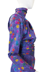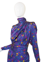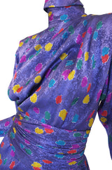 If you have been looking for that insane, over the top statement dress - this just might be it. It is made of his signature printed silk in a strong bright combination of purple with multi-colour dots of color scattered over it. The shoulders are strong and made even more so with padding and seaming that highlights them. Below the shoulder the bodice is loose fitting and the sleeves set wide into the sides and then they narrow into slim, zipped cuffs. The waist cinches in and the original belt made of a matching fabric is present to accentuate it even further. The skirt is cut to be short and fitted - its that perfect eighties silhouette that still works now. Excellent, appears unworn, condition.