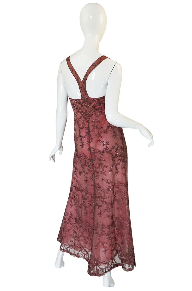 Valentino pieces are always stunning and I love how the recent resurgence of the house really stays true to Mr. Valentino's original vision that you can see so clearly in pieces like this. This is a stunning piece and could easily be a piece form the recent Valentino runway - many of the pieces have this same feel and attention to detail with the fabric choices as this one does. You can clearly see the influence of the nineties in this piece with its nod to sportswear in that racerback halter. This gives it a sexy little sports touch while still keep the dress at a high glamour level. The most striking thing about the dress is its elaborate silk netting exterior, dyed a soft dusky pink with hand applique detailing of lace and hand beading. The netting has been treated so it has an almost starched feel but without being so stiff it does not move - it has just enough so that it holds the shape it is meant to be. The applique and beads follow the lines of the dress like a vine trailing over the surface from top to bottom. All of the bead work is done by hand and because the colors of the beads are meant to match it just adds a depth and level of texture rather then being flashy. On the inside it is immaculately constructed with a cup built in at for the breasts so no undergarment is needed and it is finished with two layers of fine, light pink silk chiffon inside. It is almost weightless and stunningly beautiful - a real work of art. Exactly what one would expect from Valentino. Excellent condition.