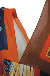 The sleeves are cut wide and full, in a manner that gives a nod to the kimono sleeve. Both the back and the front plunge quite low and it is cut so that the weight of the lower skirts keep it perfectly in place despite the lowness of the cut. The skirt is magnificent and literally has a full 360 degree sweep. This gives it incredible volume and movement. This one falls to just above the ankles or perhaps a little higher depending on how tall you are. The scarf printed silk that is used is light in weight and has wonderful drape as a result. The various prints and the way it is mixed over the silks is magnificent. Each of these dresses are entirely unique, with no two having the same mix of patterns and colors. Excellent condition with one small note to review below