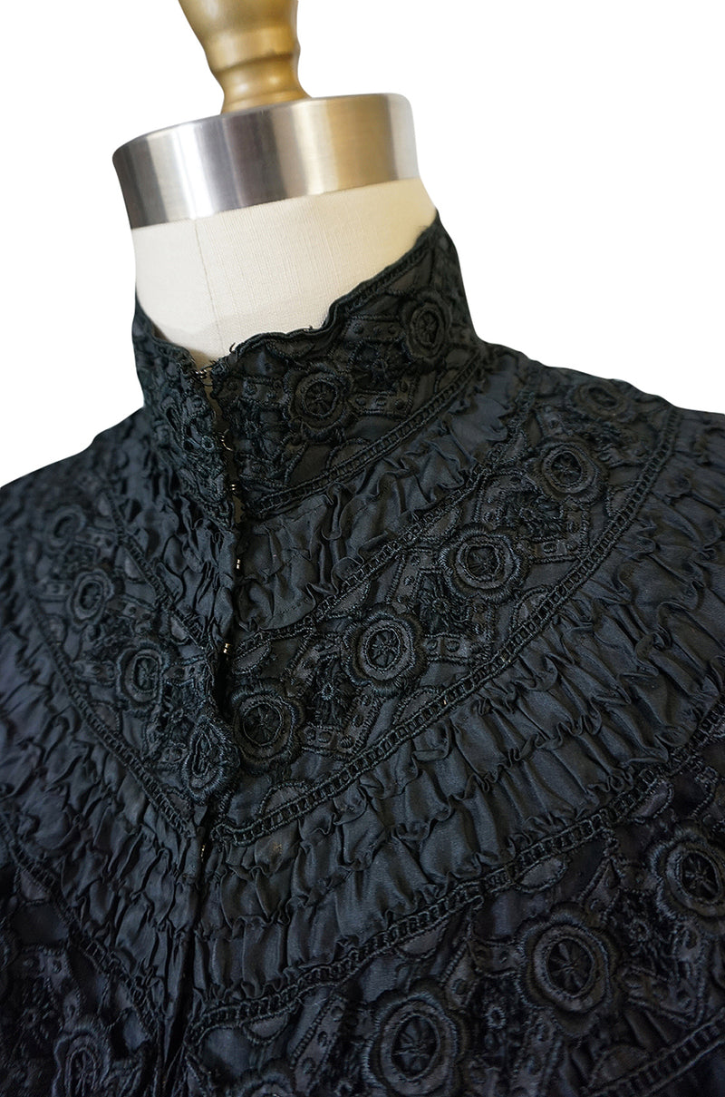 Rarely do I take in pieces from this time period anymore as exceptional pieces are few and far between but this one is wonderful and I could not resist. It is also shocking in that it is a wearable sizing, another rare occurrence. This elaborate and wonderful top is in outstanding condition and is truly a marvel. Everything about it is exquisite. It is cut with a graceful sweep inwards as it nears the hem. It has wonderful and elaborate sleeves that have a dramatic pouf at the top of the shoulder and end in a full 11 inch, curved cut cuff that is finished in a fine, flat ruffle treatment interspersed with a rows of hand done embroidered cutouts on silk. It is pleated through the back and these angle in and toward the slightly raised waistline. The front It is all finished with the same technique used on the cuffs and form a sweeping panel across the shoulders that tapers down in a point towards the waist. It is remarkable and in excellent, museum quality condition.