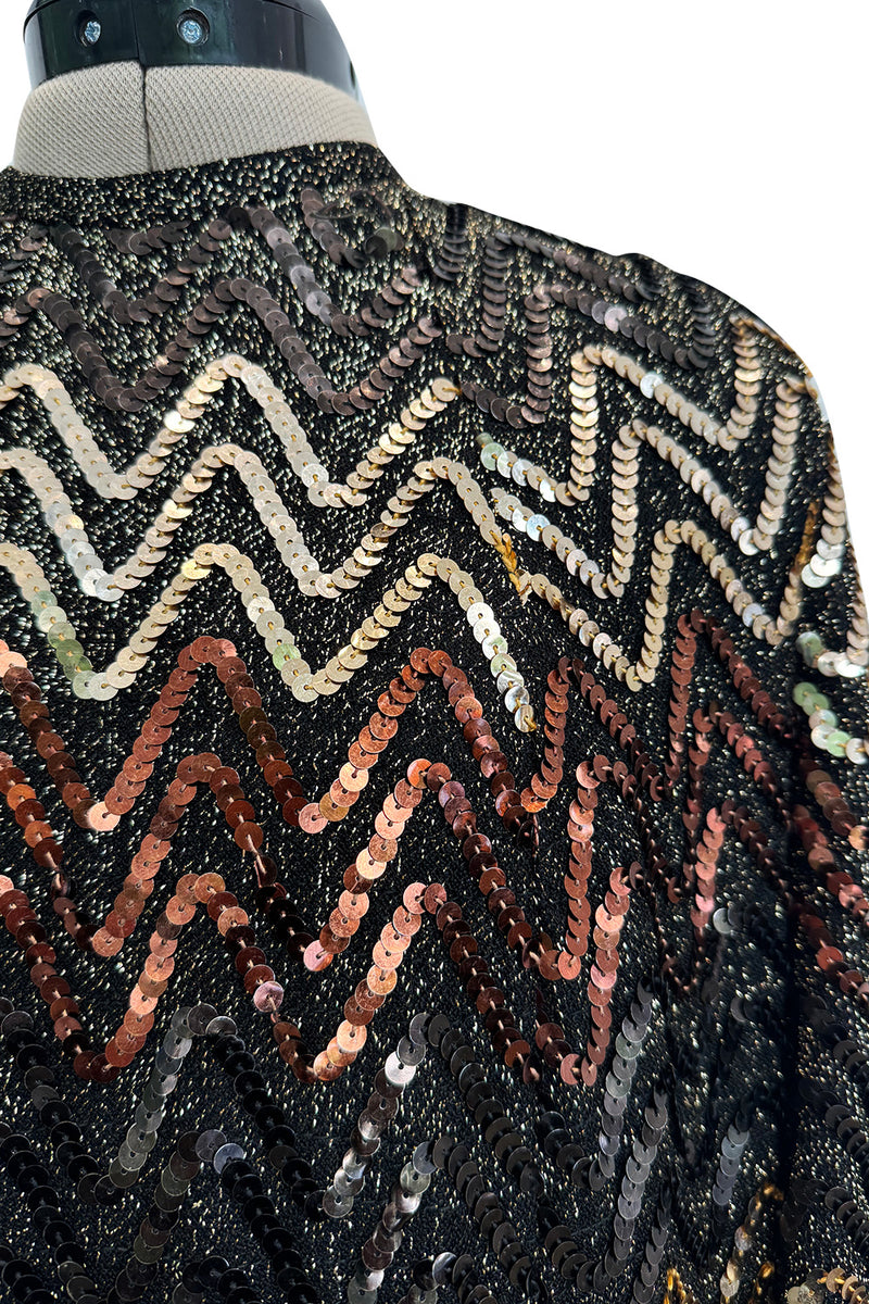 This it is one of the best evening pieces I have seen from his main line. It has a very sophisticated feel to it while still be incredibly easy to wear. The base of the dress is made from a black knit that has a gold metallic thread woven through it so that even under the sequins you are getting that splash of a metallic feel from head to toe. Onto the knit there is an incredible pattern done on sequins that make the entire dress catch the light from every angle. The sequins are a mix of black, gold and a deep copper and they are set in this stacked jagged row design. The sequins have been applied in this same pattern over the entire dress. The neckline is high and the bodice kept simple. It is cut to skim over the bust and the knit comes in just a bit at the waist to give a touch of shape. The skirt falls to the ground from there and widens out gradually as it nears the hem. The sleeves are long and easy. The incredible fabric makes the dress feels dramatic and sexy. It has a very Old Hollywood move star feel to it and it is even better once on the body. This is a dress that you just slip on and it is perfection. It appears to have been worn very little if at all. Excellent condition.
