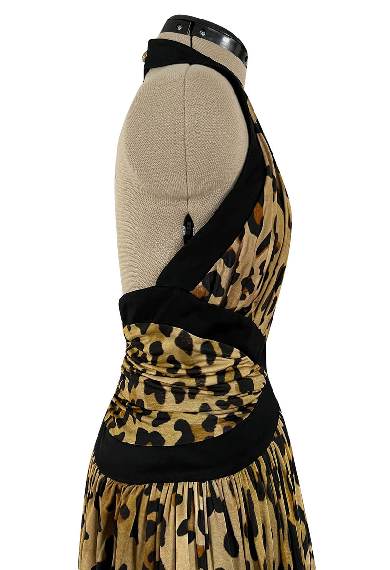 The dress is made from a leopard print silk jersey that is cut supermodel long. The fabric has some weight to it because of the sheer amount of it that there is and this helps to keep the drape and flow of the skirt perfectly in place once on the body. It is cut in a high set halterneck at the front and the fabric there is gathered in vertical folds so that it skims over you. A wide band of black curves around the neck and then down the sides. At the waist it forms a criss cross pattern around the waist that curves around to the sides. At the side of the waist between the black the fabric is again gathered in for detailing. The black bands gives the illusion of a waist cinching corset belt and draws the eye while highlighting the curves between the bodice and that amazing skirt. At the back the dress closes at the nape of the neck with two snaps and both are topped on the exterior of the strap with a gold raised lion head. It scoops into a low curve under that to leave your entire upper back bare. The signature chunky, exposed Balmain zipper sits low at the back. The skirt falls to the floor from there and there are yards and yards of fabric in it. The hem is cut longer at the back so that you have a bit of a train and at the center of the front it is split to the thigh. So when you walk you have this flash of leg showing and when you walk away it is equally as dramatic. It is amazing. It was never worn and is like new. Excellent condition