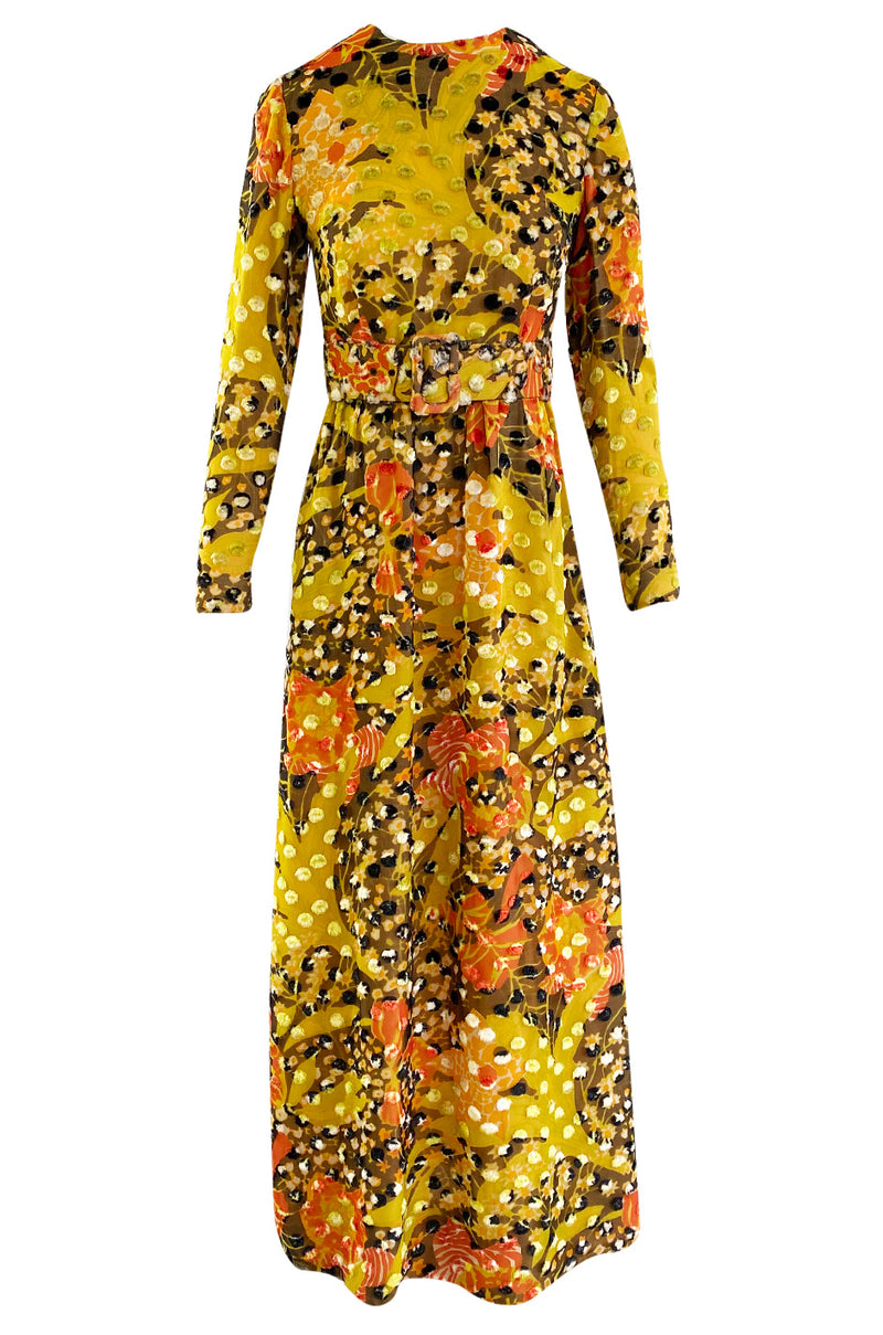 Famous 1971 Bill Blass Vogue Featured Yellow Chenille & Silk Maxi Dress w Elaborate Feather Collar