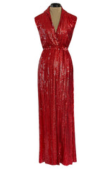 Iconic 1970s Halston Couture Glossy Red Sequin Full Length Wrap Dress w Plunge Front