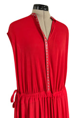 This is one of the easiest dresses to wear that has ever existed. You just slip it over the head and then adjust it with the tie at the dropped waist seam and walk out the door. That tie that runs through the seam around the hop allows you to wear it low and loose or you can cinch it in and wear it higher up on the waist and have the top blouse over. The jersey is fantastic and the red is one that should work on most skin tones. The neckline is detailed with a small strip of red leather that circle around the the neckline and down the front to the waist seam. It is studded with silver studs for the subtlest of details. It falls loose and easy over the body and the skirt has yards and yards of fabric. Besides wearign it this way you could also wear it the other way around. And it has pockets. This is the genius of Phoebe where she manages to have something be so perfectly simple and easy and yet have so much drama at the same time. I love it. Excellent condition