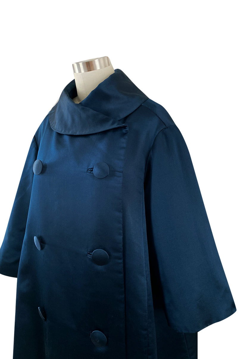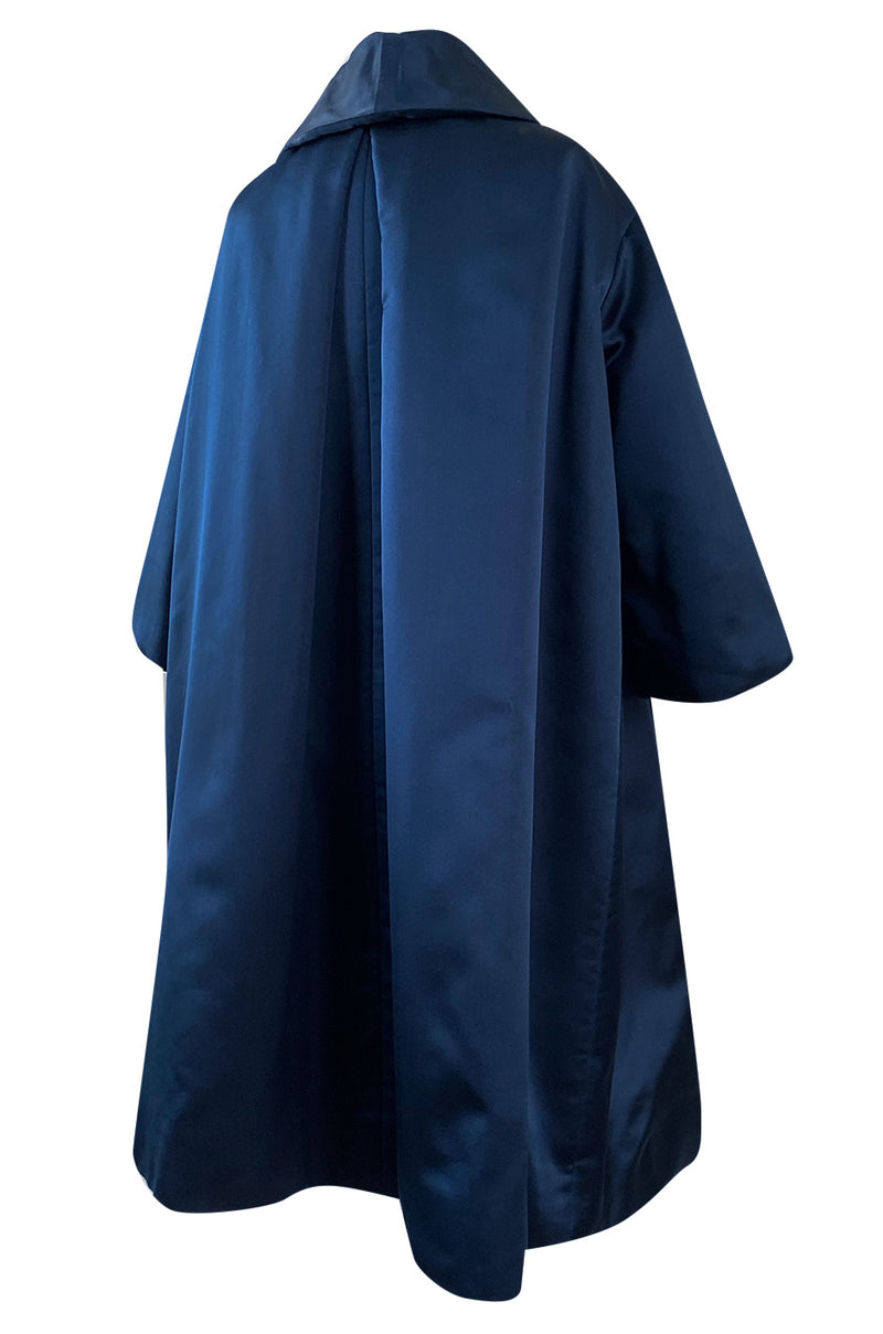 The coat is made from a heavy, deep blue silk with a satin finish. The coat would have be considered to have been a ‘Petite Theatre’, a more formal evening coat, during this time period. A neat rounded collar wraps in a curve around the neck and closes just off to the side. This sits above a double row of buttons. The buttons have been hand made and covered in the same silk as the coat. Each button slips into a perfectly made button hole and all the work is done by hand. Pockets are hidden along the curving seams that are inset sightly towards the front of the coat so that the vertical line stays clean and simple. The back has tremendous volume and this fullness is created by a soft inverted pleat that opens from just under the back collar and extends down to the hem. Besides the volume this creates it also directly relates to the shapes that Yves intended the pieces in this collection to have. From the side, this gives it a bit of caped back feel and would have layered perfectly over the fuller backed skirts of the dresses in this collection. The silk that has been used is of the highest possible quality and the colour is an even darker shade of blue in person then how it photoed here. It appears to have been worn very little and is in outstanding condition. The proper numbered Haute Couture label is present and the coat is made entirely by hand to the standards demanded of Haute Couture. This is an exquisite example of Yves Saint Laurent's very earliest work with as a couturier and as the head of Dior. It is an outstanding piece of Haute Couture from one of the most important houses of our modern era. Excellent condition
