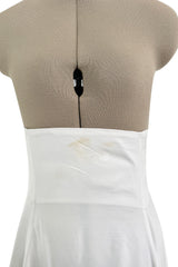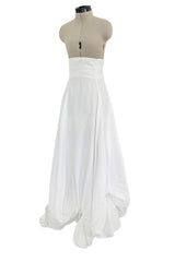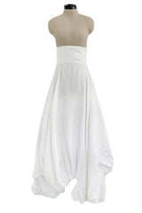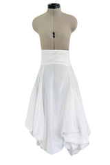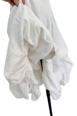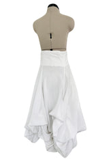 When we photoed the skirt we did it to show how you can change the look of the hem depending on if you choose to button the buttons up, or leave them undone. there are many configurations that you can do, including buttoning some of the button holes onto the same buttons inside or leaving them all undone and having a longer length skirt. Another key component of the show where these extremely high waists that you would then put a large belt around. My client told me that she often wore this as a strapless dress as well and if you are small enough through the bust to do so, you can have that added option. There is boning through the sides of the waist that help to hold it up and in place. The amount of fabric that the skirt has, and that unusual way the hem has been sewn combined with the buttons, really does give it the most fantastic and fascinating movement when you move. The fabric is at ultra soft white cotton or cotton mix. This piece was only ever owned by one person and it was loved and worn. It does have some faint marks on it but it doesn't take away from the importance or rarity of the piece.