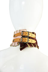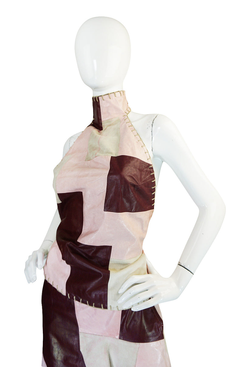 The set itself is amazing. McQueen's methods of cutting and construction were both innovative and revolutionary. His work in leathers was second to none and this two piece ensemble is the perfect illustration of that. The leather is used as one would a fabric and cut and placed for his masterful draping and The halter top is cut exceedingly low in the back.The buckle bondage elements became a common theme and his workmanship in leather in unmatched. The top buckles behind the neck and the back is left completely and utterly bare. The skirt is meant to sit low on the hips and flares out in the perfect slightly exaggerated A-line. The patches are a combination of glossed pale pink leather, an off-white colored suede and then a deep burgundy leather. The natural color leather straps at the back of the neck and at the lower back on the halter add a stark contrast. Heavy rawhide whip stitching finish both pieces. An amazing piece and utterly collectible.