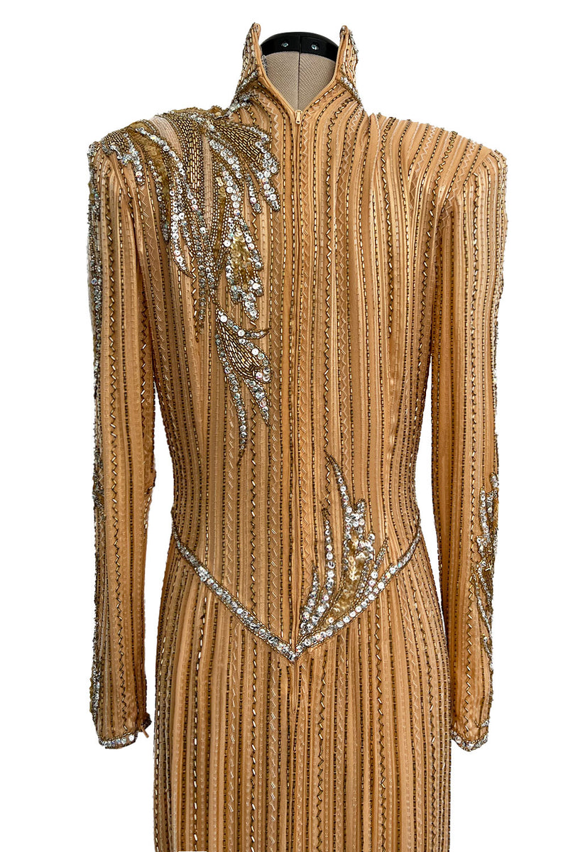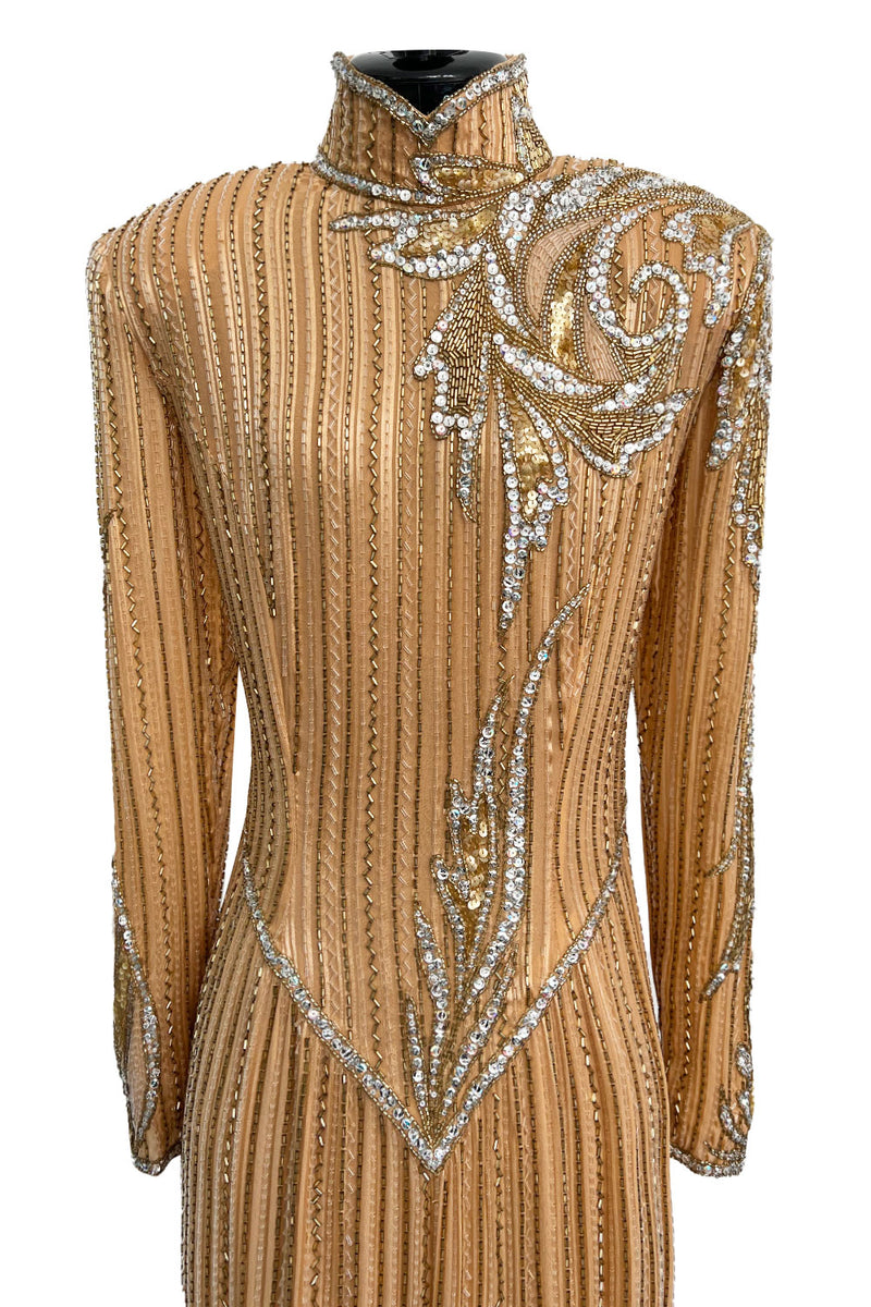 This is an amazing dress that is extremely flattering even though you are covered completely. The base of the dress is made of a soft peach silk and then onto that is the vertical bands of detailing that completely cover the dress. That design that you see is made up of a combination of muted gold and clear glass tube beads that have been set in vertical rows over the entire dress. There is a more intricate pattern over that on one shoulder, around the collar and down the sleeves that is made up of tinier tube beads, muted gold sequins and rhinestones. And then scattered within all of that are little highlights done in a silver sequin with a tiny clear bead at their centers. This ultra glamorous combination gives the dress an extra layer of texture and glamour as every inch of it catches the light and sparkles. The dress has a decent weight to it when it is off of the body because of that extensive bead-work, and yet once on the body it drapes in a way that it is balanced and not at all unwieldy. The necklace is high and the collar is extremely detailed. I love the detailing on the outside of each sleeve. The waist is brought in just a touch to create shape and that curved down and angled seam there that is detailed with more rhinestones and beads helps to really lengthen the feel of the dress around you. The skirt call store from there and slightly widens out as it nearest the ham. It's a long slim shape combined with all those vertical rows of bead work make you look tall and lean once you are in the dress. Excellent condition.