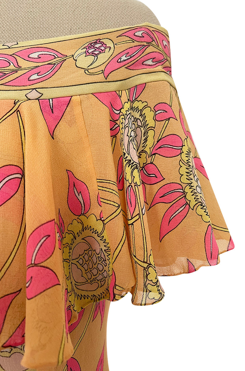 Prettiest 1960s Emilio Pucci Pink & Yellow Print on Peach Silk Chiffon Ruffled Off Shoulder Dress