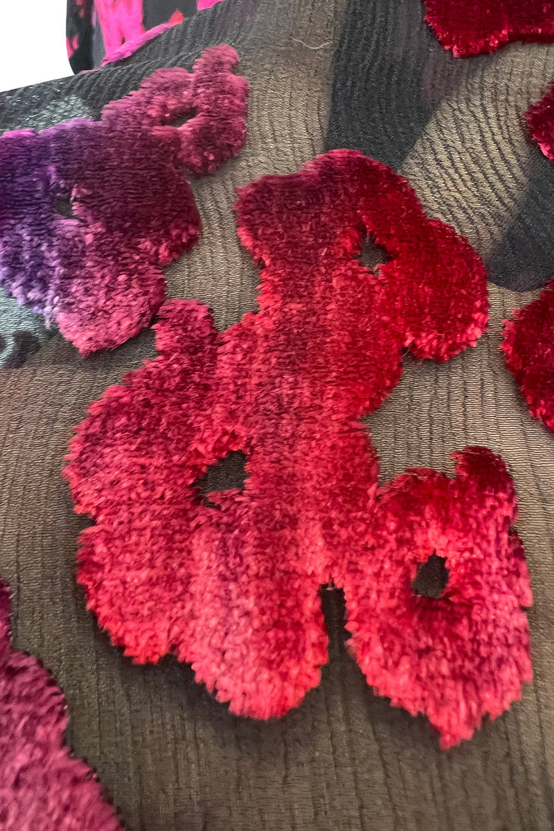This beautiful dress is made out of a black silk chiffon and then it has a floral design that it's fused onto the silk. The colours that are used are absolutely gorgeous. They range from this deep fuchsia to brilliant pinks and then they slowly change to soft corals and even pale lavenders in parts. The effect of the velvet popping off of the transparent silk chiffon is this fantastic play of texture and colour that has to be seen in person. As with many of his pieces there is a play on volume and proportion in the dress. It has a slight dropped waist that blouses over an inner seam set around the top of the hips. The neckline is squared off at the front and at the back. I love how it is edged in a little black velvet ribbon. Running across the front of the neckline is a thin velvet strap that has a flat bow at its center. Each sleeve is cut full and end in the same velvet ribbon edging. The bodice skims over you and then the skirt falls from there and is actually quite full. When you're standing still it hangs straight but when you move you get this beautiful volume and floating affect around you. An attached velvet ribbon sit on one hip and wraps around you to tie in a bow on the other side. This is a dress that really only comes to life once it's on the body. It appears to have never been worn or worn very little. Excellent condition