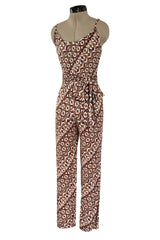 Rare 1970s Emilio Pucci Printed Taupe & White Silk Jersey Halter Jumpsuit w Belt