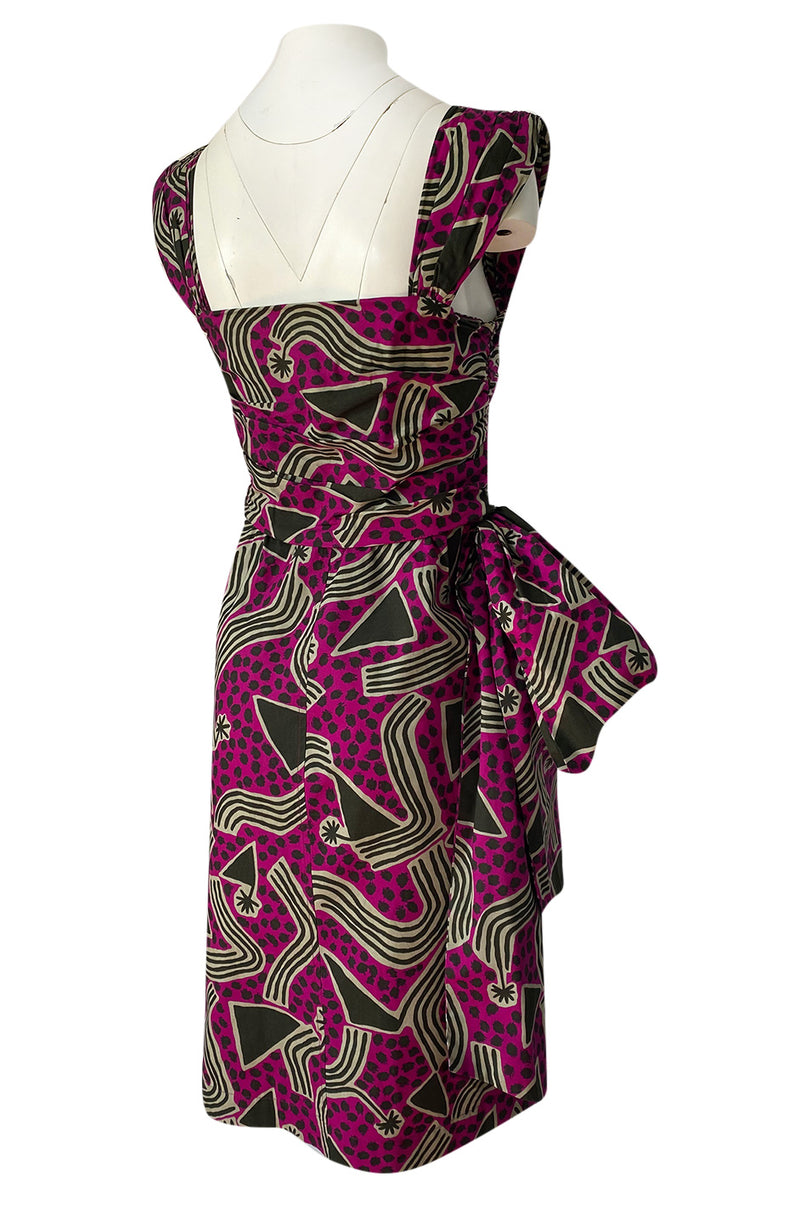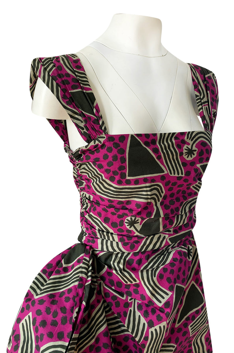 This is a gorgeous little YSL dress form the 1983 resort collection that has a fun and exotic vibe to it. The dress is made from a crisp cotton that has enough weight and structure to it to perfectly fall into the line that Yves desired it to have. It has a nod to the Hawaiian dresses of the forties in its color and cut. I love the bold purplish-fuchsia color that is combined with a soft grey and a charcoal to make up the abstract print that covers the dress. The shape is soft and cut to skim over the body. The dress is suspended from wide straps that curve around each shoulder. The bust is more fitted and gathered for fullness. and shaping. The skirt is a faux wrap that overlaps over itself along the side with the bow, So when you walk or sit it will open a bit to show some leg. On the one hip is a large half bow that adds amazing shape and detailing. It is amazing on the body. It appears to have never been worn, or worn very little. Excellent condition