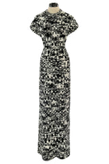 This Chanel dress is wonderful. The cut is simple and classic from the front and yet the back is very avante garde and unique. It is made from a soft but chunky boucle feeling knit that combines black with a grey tinged ivory to keep with the theme of the show. On the runway Karl paired it with knit versions of his signature gloves and a low boot. The wool is light in weight but with enough substance to hold the shape. The light weight makes it a lot easier to wear then you would think. The look of weight comes from the nubbiness of the knit but it is actually quite light. The bodice of the dress has a scooped neck that is finished with a ribbed pattern. The sleeves are barely there and are also edged in that same ribbed pattern for contrast. It is cut to skim over the bust and waist. The skirt continues from there, gliding over the hips and then the dress falls to the floor and gently widens out as it nears the hem. It is in its original supermodel length. At the back it has a curved cut out that leaves the entire back exposed but then he has crossed straps over it for a bit of a peek-a-boo effect. All of the edges are finished in a fringe from the same wool to give the dress that tattered feel that was the theme of the show. Glittering black rhinestone encrusted buttons with the double C embossed onto them close the neck and straps at the back. The construction is immaculate. Excellent condition.