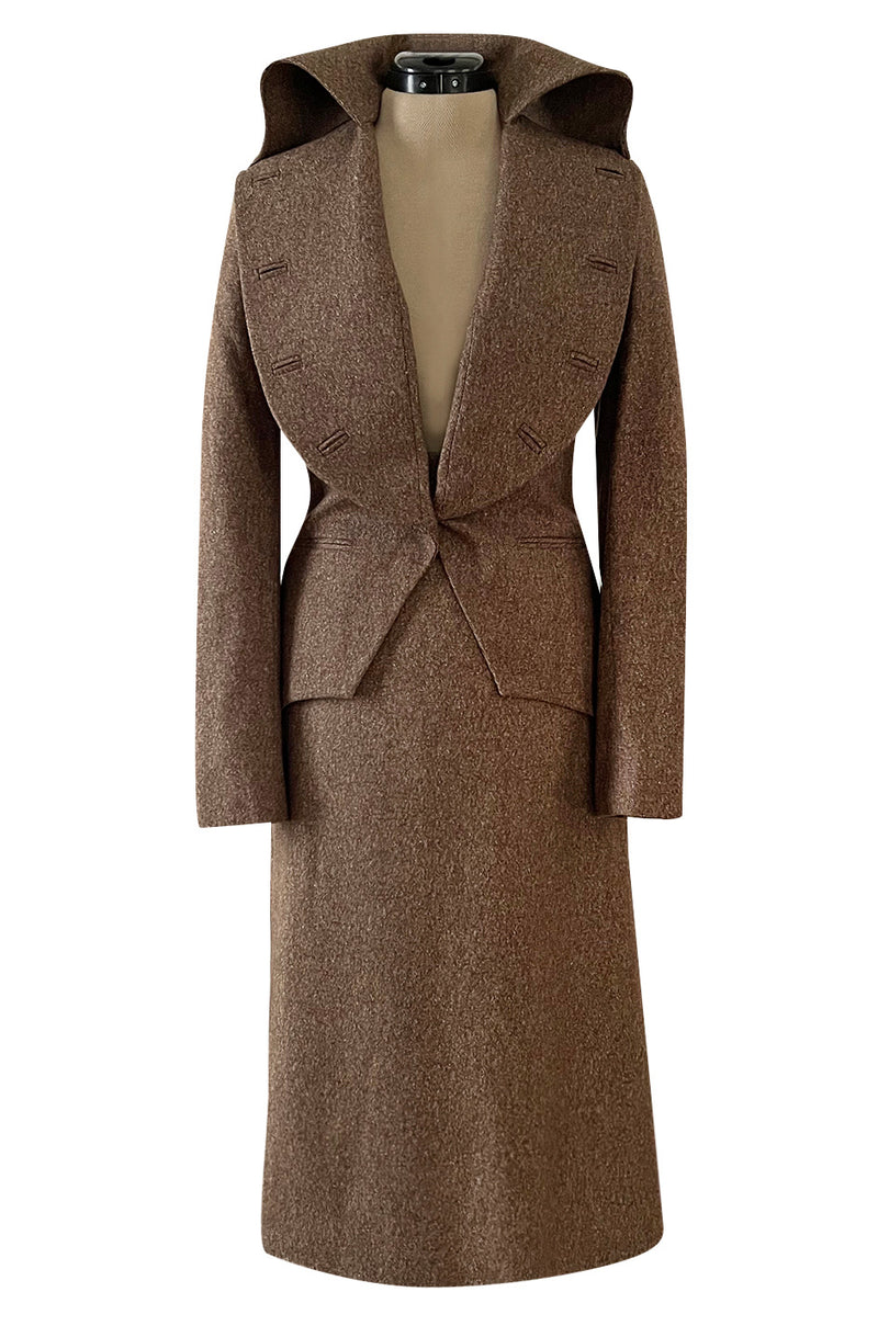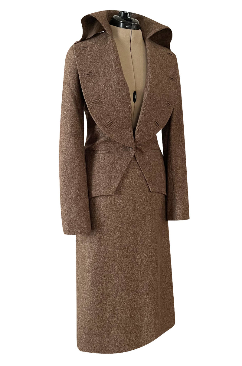 The suit is identical to the one that walked the show. Very few of these would have been produced and it is amazing to have such an wonderful piece of his work in the shop and to have the full suit. A piece like this truly showcases McQueen’s strong tailoring background and master cutting abilities. The suit is made from a mens suiting fabric and gives a nod to his heritage and strong tailoring roots. The jacket is also cut with a nod to a traditional men's suit and then he has twisted and shaped the collar and brought in the waist to create a more feminine shape. I love that it still feels very refined despite its avant grade shape and cut. The shoulders are shaped and lightly padded to hold their shape. Each sleeve is cut on a slight curve in the proper manner of tailoring a sleeve. The body of the coat is shaped with a female body in mind and is cut in at the waist for shape. It closes with a single button there. I am obsessed with the collar. It is cut to be very over-sized and covers the entire upper bodice. The lapels curve around the neckline and run down to the button at the waist. It is wonderfully wide and has been finished with a series of properly done button holes that run around the outer edge. This gives it a very unusual detailing and I love that he did not do the all too obviously step of adding buttons. The back collar is rolled and secured with a stitch at each side to create height and shape. Under the waist the jacket skims over the hips. Pockets sit on each hip and they still have their original tacking. At the back it is cut to have a panel that flares out a touch. The skirt is as wonderful. It is cut with a flat front and no band around the waist. It is also high cut so curves up at the waist a touch. It flares out as it nears the hem and there is a panel of extra fabric set to one side. This flares out and moves when you move and is quite extraordinary. You really need to watch the runway clip to see just how stunning it in on and moving. The inside is lined in a copper toned silk that picks up on the colour of the exterior. The workmanship is meticulous and it is an absolutely beautiful and a rare piece of his work. It still has its original Bergdorf's hang tag and was never worn. Excellent condition.