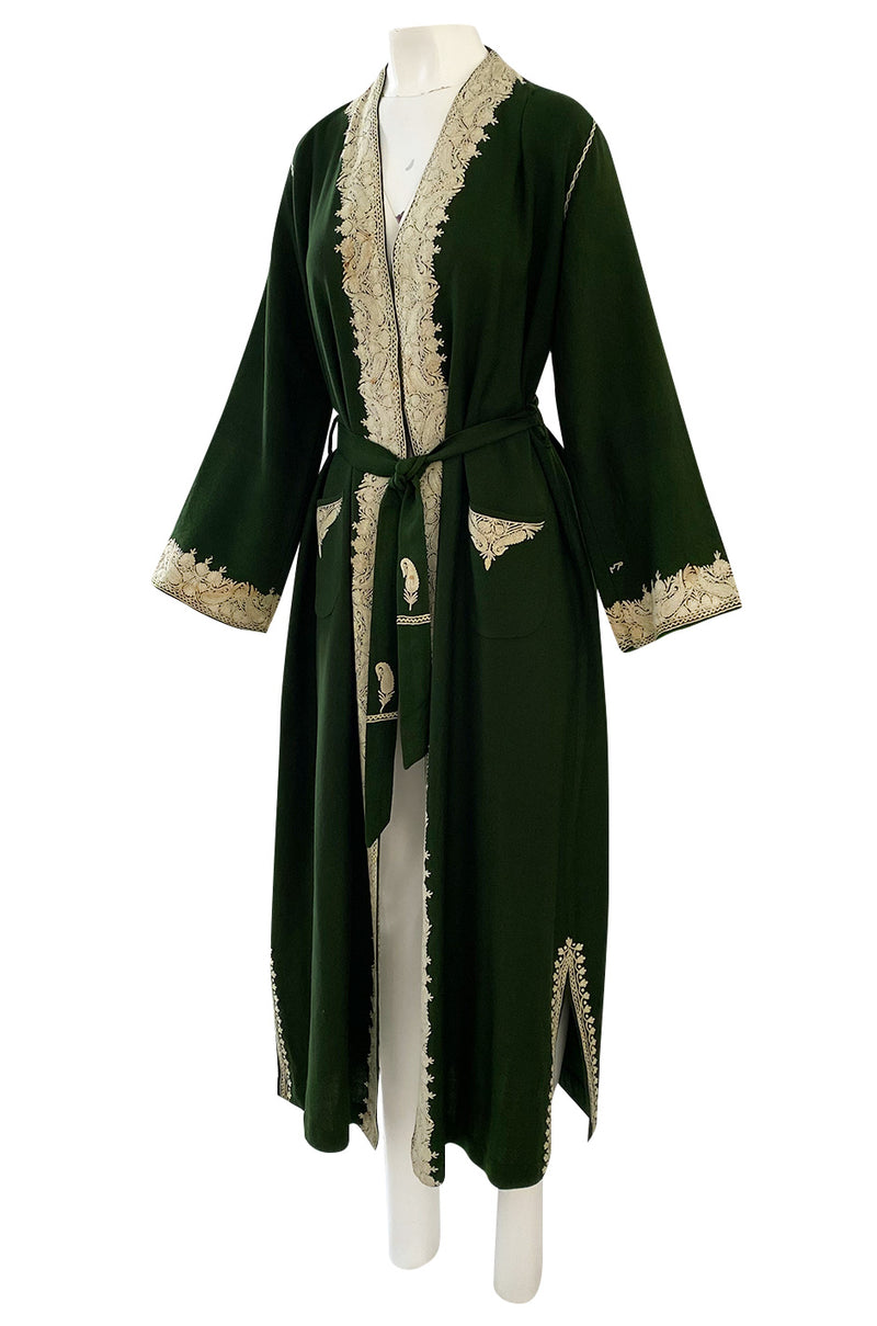 This is a remarkable antique wrapped robe that can serve double duty as a light evening coat. These are very difficult to date but I think it would be somewhere near and around the twenties. These type of pieces were constructed with a level of hand work that is getting harder and harder to find. It is not 100% perfect but its construction and beauty far outweigh its small flaws. The exterior is extensively covered with a beautiful crewel embroidery technique that has all been done by hand. The design work is exceptional. Dense embroidery work create a beautiful wide border that runs fully down the front edges, circle each cuff and adorn each little top set pocket on the hip. There is a large medallion of embroidery on the upper back, more along the edges of the side slits and even the ends of the belt have been finished with a little bit of embroidery. The base is a fine and light, deep green coloured wool. It is cut loose and easy like a mens bathrobe would be and you just use the tie belt to wrap and cinch it around you. You can wear this as a spectacular evening coat, or wrap it over something to wear it as a dress, or keep it as a boudoir piece. I love that there is a tiny bit of extra embroidery on one sleeve and I suspect that it is the signature of the artist that did this work. It is exquisite and a testament to the great craftsmanship and highly skilled technique that is rapidly being lost. Excellent overall condition with a note to review below